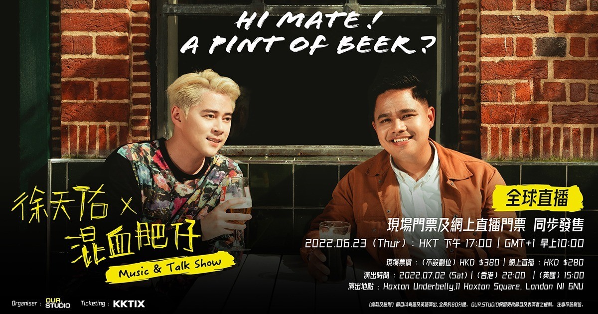 《HI MATE! A PINT OF BEER?》徐天佑x混血肥仔Music & Talk Show,共同回憶,共同分擔,用歌聲同搞笑,將全世界每個角落的香港人,拉埋一齊,於轉變之中互相鼓勵,繼續行落去。